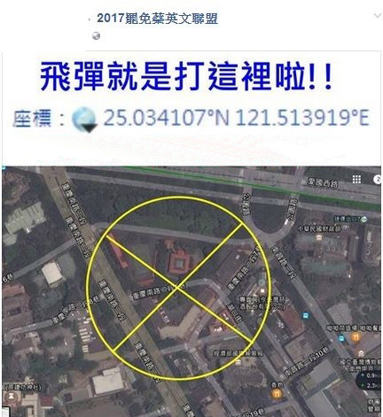 中國臺灣網(wǎng)1月4日訊 臺灣網(wǎng)友在Facebook成立“2017罷免蔡英文聯(lián)盟”社團(tuán),日前卻有人以谷歌地圖清楚標(biāo)示臺灣地區(qū)領(lǐng)導(dǎo)人蔡英文官邸坐標(biāo),并向大陸解放軍喊話:“飛彈(導(dǎo)彈)就是打這里(官邸)啦!”,在島內(nèi)引發(fā)爭議。對此,蔡英文辦公室于3日晚間作出回應(yīng)。
