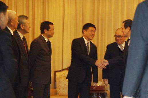 馬英九結(jié)束謁陵,走入廂房,與郝氏父子打招呼。(圖片來源:中評社)
