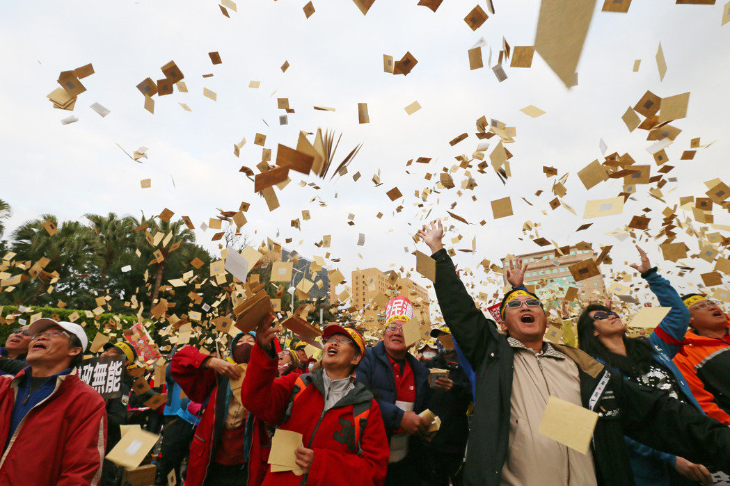 臺灣“軍公教勞”團體舉著白燈籠撒紙錢,為蔡英文當局“送終”。(圖片來源:臺灣《聯合報》)