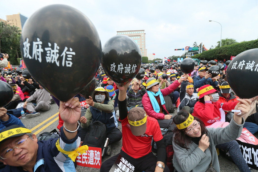 綜合臺媒1月22日報道,備受臺灣島內關注的年金改革會議22日在臺“總統府”舉行,近萬名臺灣退休公職人員來到凱道上,頭綁布條、手拿標語抗議改革,并戳破印有“政府誠信”的汽球,象征蔡英文當局誠信破產。