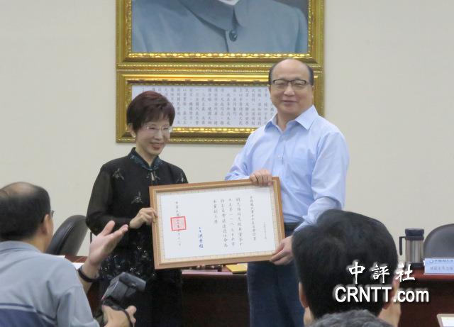 洪秀柱(左一)頒發副主席聘書給胡志強(左二)(圖片來源:中評社)