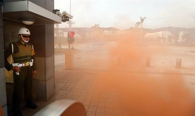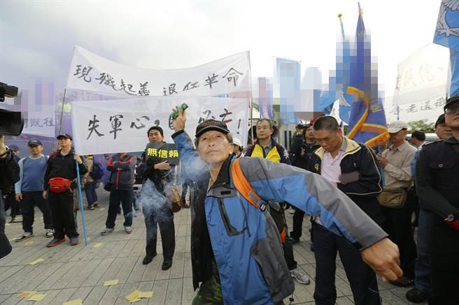 退伍軍人丟擲煙霧彈。(圖片來(lái)源:臺(tái)灣“中時(shí)電子報(bào)”)