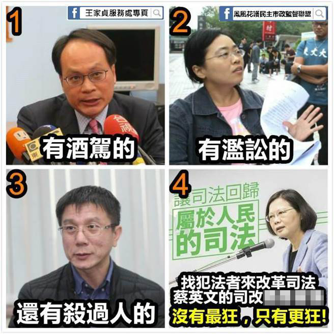 據報道,“鳳凰花護民主市政監督聯盟”Facebook粉絲頁特為此事整理制作出圖表,上寫:找犯法者來改革司法,蔡英文的司改會議沒有最狂,只有更狂!圖表中直接在“時代力量”創黨大將林峯正照片上標記“有酒駕的”;在中正大學法律系教授盧映潔照片上標記“有濫訟的”;在昔日知名財經律師劉北元照片上標記“還有殺過人的”。