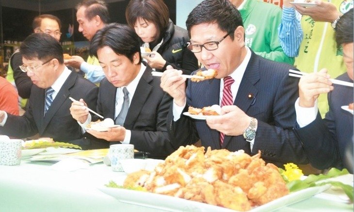臺南市長賴清德(左2)公開場合吃雞肉證明安全。(臺灣《聯合》報系資料圖)