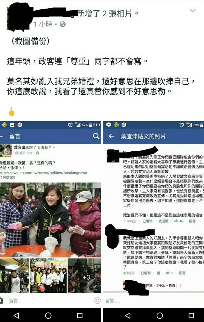 該網友在葉的貼文下留言痛斥:“第二名?請‘委員’先修正你們自己團隊包含你們的心態吧。借著人家的婚宴大喜場子想進行宣傳,主人家已經明確說明整個婚宴活動不準政治宣傳活動進入,包含文宣品面紙等發放。新郎本人拒絕選舉團隊入場發放文宣廣告等,竟還被團隊嗆聲。為什么婚宴場合不能拒絕你們進來?為什么拒絕了你們,還要被你們的臭臉和你的團隊言語攻擊?尤其是‘委員’您進場后,連主人家從您旁邊走過去,您都不知道。還想直接走上臺,坐上位。政治我們不懂,但是這不是您該這樣表現的場合。”