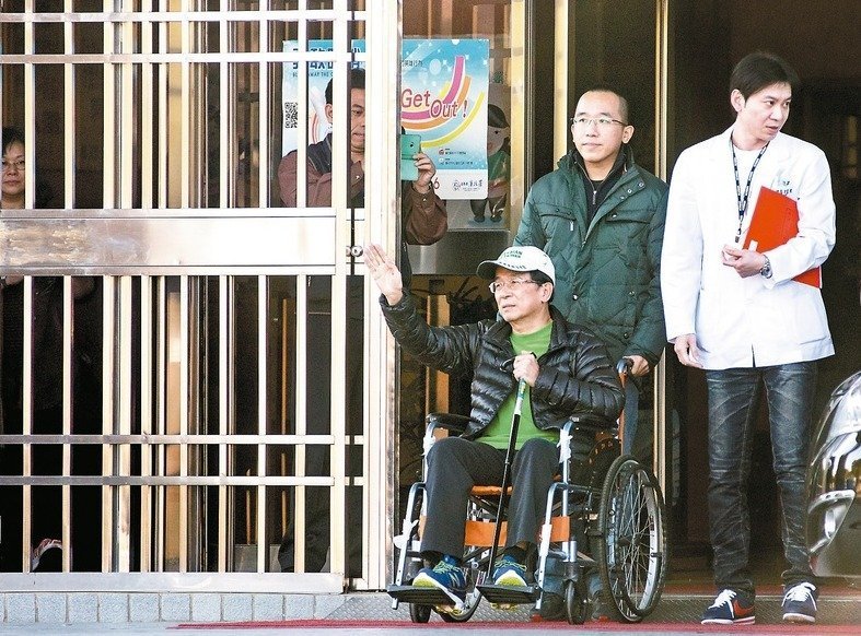 陳水扁保外就醫(yī),由兒子陳致中推著輪椅出監(jiān)。(圖片來源:臺(tái)灣《聯(lián)合報(bào)》)