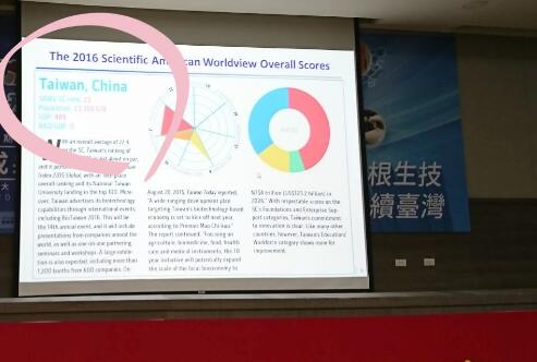 臺灣“生技醫藥國家型計劃”成果發表會22日在“臺大醫院國際會議中心”召開。在計劃總主持人楊泮池介紹成果的簡報上,出現了“Taiwan,China”。這被“綠委”林靜儀發現,并將簡報畫面上傳到其臉譜上,表示,“蛤?我看到什么?楊泮池校長,你準備簡報時覺得沒問題嗎?”