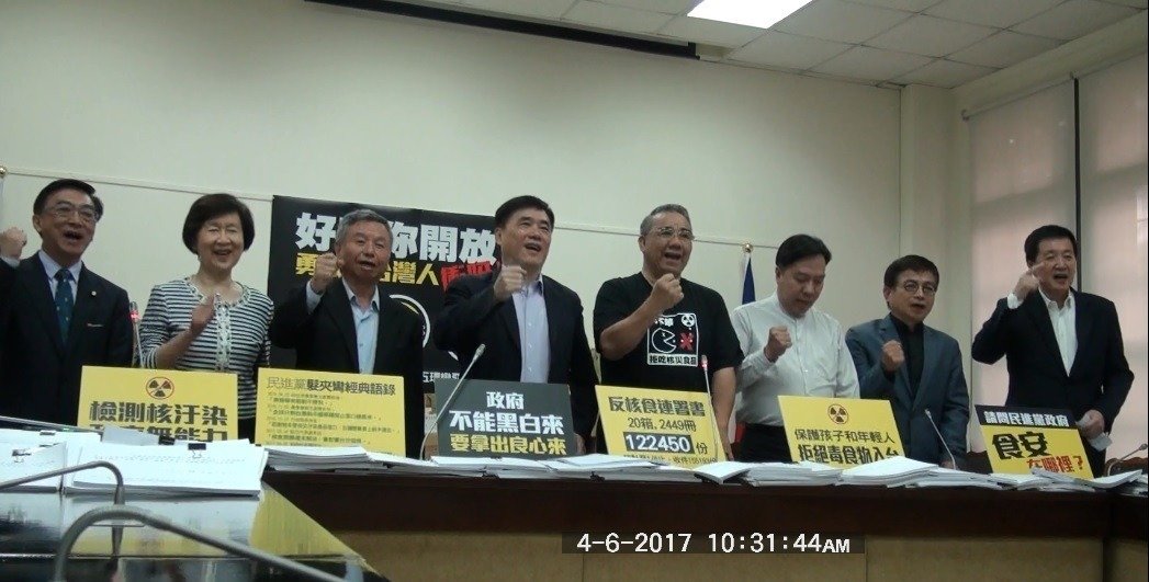 國民黨團“立委”廖國棟、賴士葆、費鴻泰、黃昭順、蔣萬安、李彥秀、前衛生署長楊志良、食安學者孫璐西與學生家長代表,6日上午都出席這場記者會,現場展示出12萬余份民眾聯署書。國民黨團表示,民進黨當局近期已陸續鋪陳核食與美豬進口的氣氛,若當局強硬實施,國民黨將選擇上街頭、遍地烽火,包圍海關與衛福部。