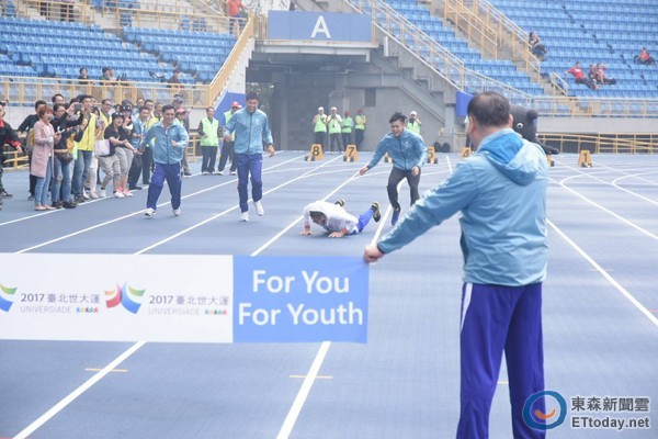 中國臺灣網4月7日訊 據臺灣“東森新聞云”報道,2017臺北“世大運”將在8月舉行,臺北市長柯文哲今日(7日)上午前往臺北田徑場進行場館整建完工視察,并在“世大運”培訓選手及“熊贊”(“世大運”吉祥物)陪同下進行“試跑”。沒想到才開始3秒,柯就因重心不穩當場跌倒。他在會后受訪時笑稱“還好,表示跑道還不錯,跌倒還蠻有彈性的”。