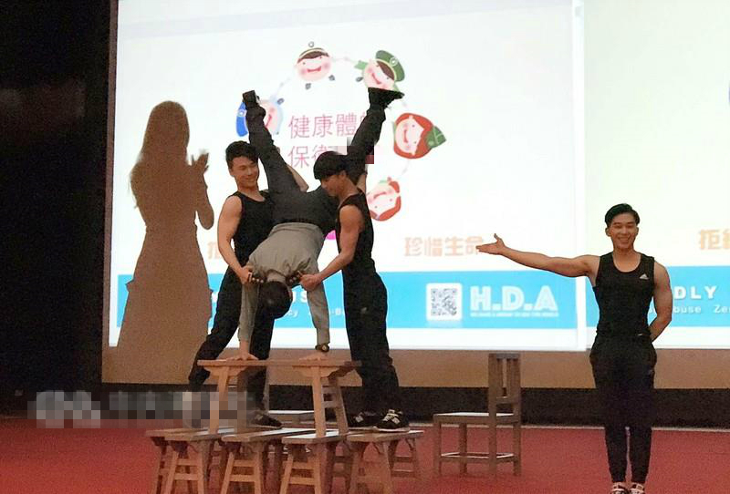 會中并邀請崇右技術學院“撼動H.D.A”特技藝術劇團,以多元活潑的宣教方式,鼓勵官兵堅定夢想,堅決向毒品說“不”。過程中,“撼動H.D.A”團長許鈺祥在團員協助下,將木椅堆棧至兩層樓高度,于最高點表演倒立后,并坐在最高處與官兵合唱“我的未來不是夢”。62歲的鄭德美更上臺和“撼動H.D.A”一起演出,由團員扶著進行倒立,希望借由活潑的宣教方式傳達反毒理念,令官兵留下深刻印象。