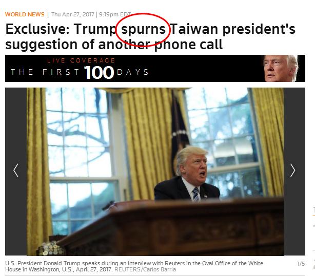 路透社4月27日發布題為“特朗普‘一腳踢開’蔡英文的再次通話的建議”獨家報道