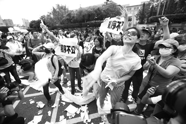 24日,反同團(tuán)體在得知“釋?xiě)棥苯Y(jié)果后怒撕標(biāo)語(yǔ)。
