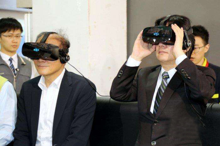 賴清德(右)年初在臺南陪林全(左)體驗VR(虛擬實境)。(中評社圖)