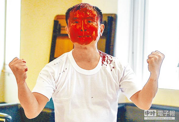 有人用罐子裝著紅漆往自己身上潑,呈現出滿頭及滿地鮮血的畫面。(圖片來源:臺灣“中時電子報”)