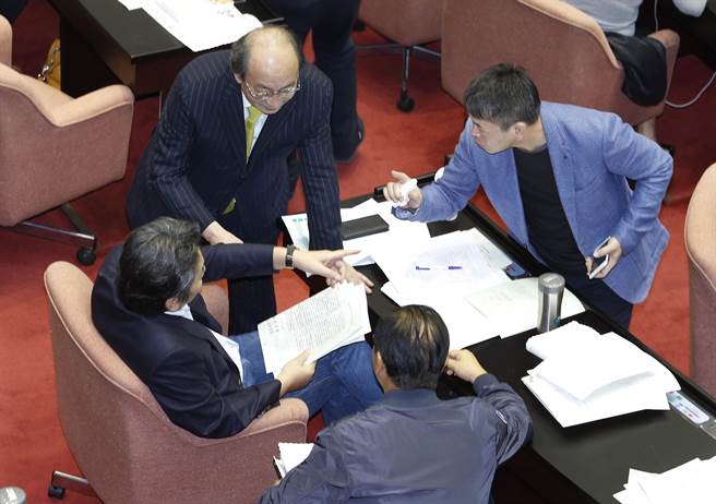 臺“立法院”臨時會5日“三讀”通過“前瞻基礎建設特別條例”。圖為民進黨團總召柯建銘(左上)、親民黨團總召李鴻鈞(左)、國民黨團總召林德福(下)、書記長林為洲(右)在議場內溝通協(xié)商。(圖片來源:臺灣“中時電子報”)