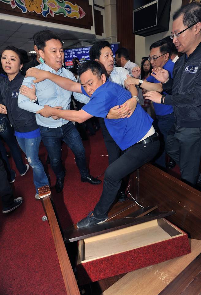 藍、綠“立委”們爆發推擠沖突,發言臺也在雙方拉扯中應聲倒地,現場混亂。(圖片來源:臺灣“中時電子報”)