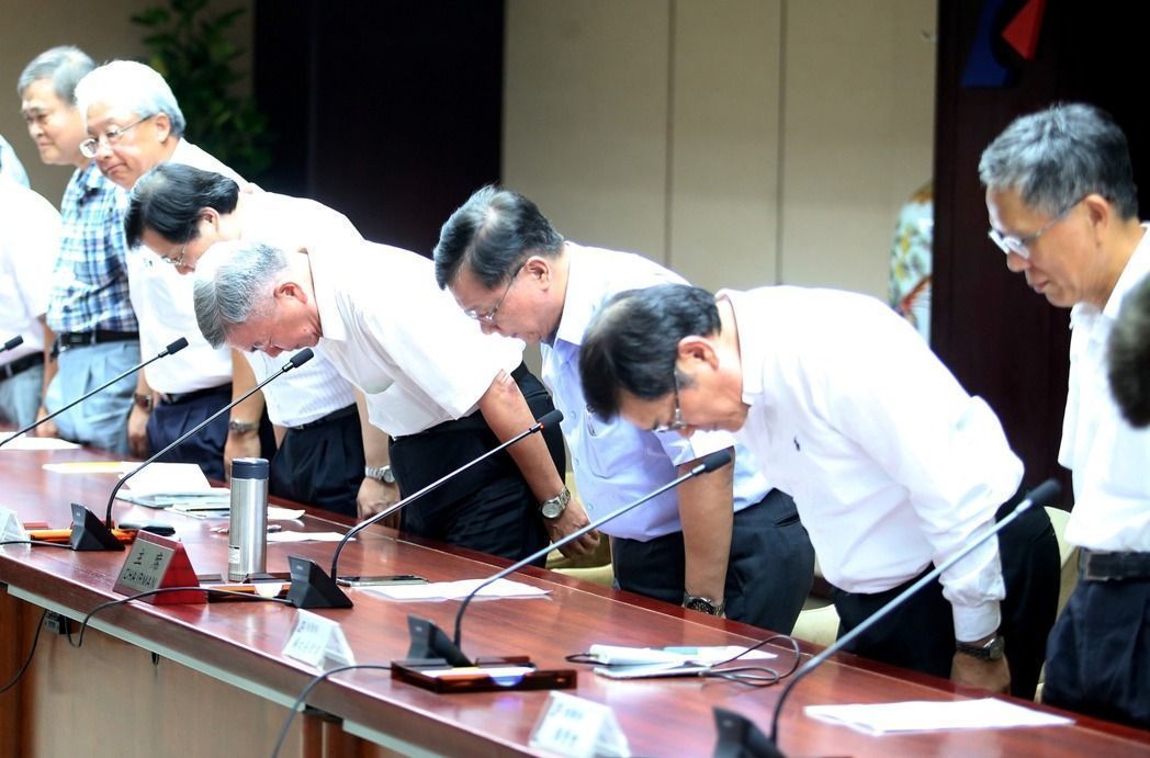 全臺15日無預警大停電,經(jīng)濟部門及臺電晚間召開記者會說明停電原因,“經(jīng)濟部長”李世光(右3)在會中率領(lǐng)相關(guān)人員向社會大眾鞠躬致歉。(圖片取自臺媒)