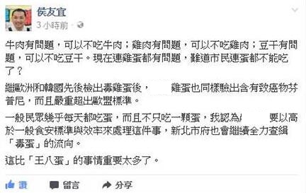 侯友宜表示,牛肉有問題,可以不吃牛肉;雞肉有問題,可以不吃雞肉;豆干有問題,可以不吃豆干。現在連雞蛋都有問題,難道市民連蛋都不能吃了?