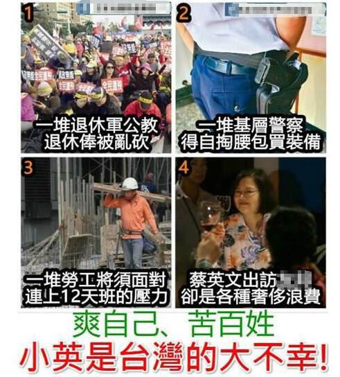 中國臺(tái)灣網(wǎng)11月8日訊 據(jù)臺(tái)灣《中時(shí)電子報(bào)》報(bào)道,蔡英文當(dāng)局上任后引發(fā)爭議不斷,近日,臉譜網(wǎng)有社團(tuán)直嗆“小英”爽自己、苦百姓,“一堆退休軍公教退休俸被亂砍、一堆基層警察得自掏腰包買裝備、一堆勞工將須面對(duì)連上12天班的壓力,蔡英文出訪‘友邦’卻是各種奢侈浪費(fèi)”,更嘆其“是臺(tái)灣的大不幸”!