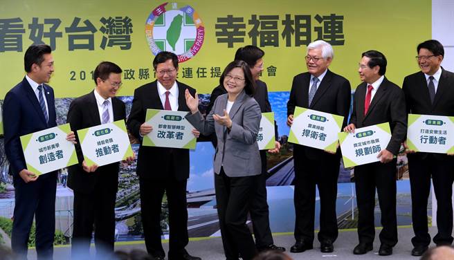 民進(jìn)黨主席蔡英文(中前)29日率新竹市長(zhǎng)林智堅(jiān)(左起)、彰化縣長(zhǎng)魏明谷等9位執(zhí)政縣市長(zhǎng)同臺(tái),宣布民進(jìn)黨中央通過(guò)提名2018年競(jìng)選連任。(圖片來(lái)源:臺(tái)灣《中時(shí)電子報(bào)》)