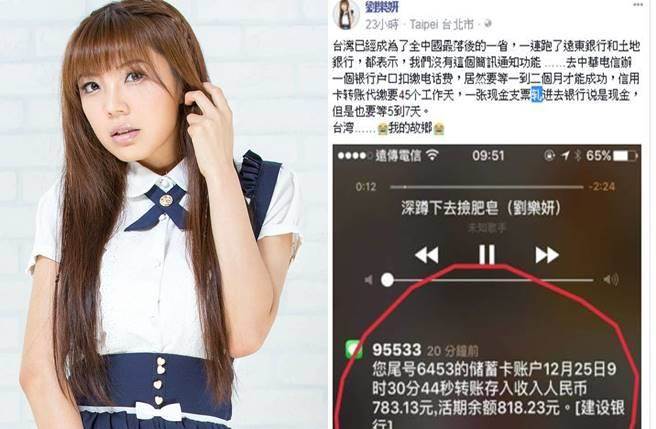 劉樂妍昨日在臉書發文,開頭就炮轟“臺灣已經成為了全中國最落后的一省”。她表示,在臺灣趁著空檔去了遠東銀行和土地銀行辦事,才發現沒有短信通知功能;去“中華電信”申辦銀行戶頭繳電話費,沒想到作業流程竟需要一到二個月;信用卡代繳要45個工作日,就連現金支票入到銀行也要等5到7天。如此的低效讓她不得不感嘆:“臺灣…我的故鄉”。(中國臺灣網 楊永青)
