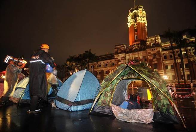 “時代力量”助理群在凱道上搭起數個小帳篷。(圖片來源:臺灣《中時電子報》)