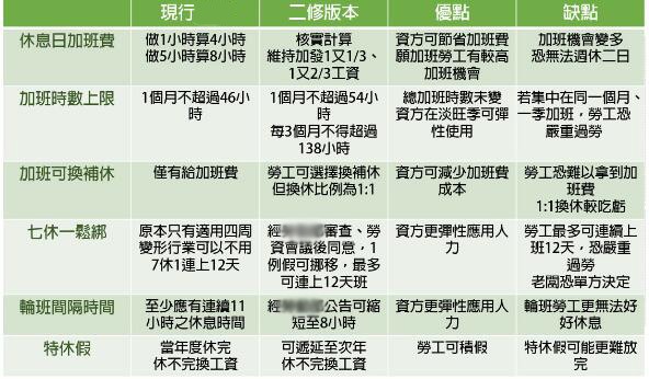 臺灣“東森新聞云”針對“勞基法”新舊版作比較,以及詳列“修法”前后的優缺點。(圖片來源:臺灣“東森新聞云”)