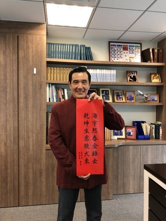 30日,馬英九公布狗年的正式春聯(lián),“海宇熙春金雞去,乾坤生意駿犬來”,向眾人祝福狗年旺旺,財源滾滾,臺灣風(fēng)調(diào)雨順,字跡也再度獲得網(wǎng)友好評。