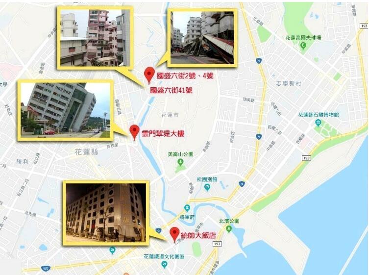 臺灣土木技師公會花蓮辦事處長陳水生說,經土木技師初步勘查,在昨晚強震倒塌的4棟大樓中,統帥飯店和云門翠堤大樓的1樓都是騎樓,另外國盛六街2、4號的白金雙星大樓及國盛六街41號的吾居吾宿大樓,樓高分別是6樓和9樓,但1樓都設計成停車場。對此他表示,這4棟建物的共通點就是,1樓的柱子多、墻體少,且又位于米侖斷層帶附近,一遇到強震,脆弱的1樓支撐不住上方樓層的重量,當然就“下跪”。