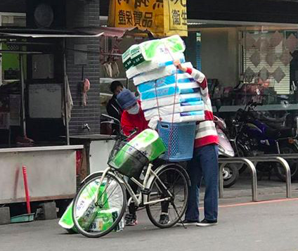 阿伯、伯母正想方設(shè)法把買(mǎi)來(lái)的十串衛(wèi)生紙固定在自行車(chē)后座上,被網(wǎng)友稱(chēng)為“衛(wèi)生紙?zhí)丶肌薄D片擷自“爆廢公社”。