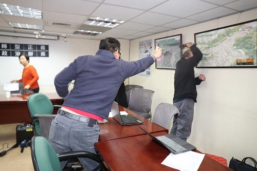 胡志偉表示,因自己頭發有點少,會隨身攜帶生發劑,今天和2位同伴剛好“路過”記者會,看到蔡丁貴頭發少,就噴他生發劑,大概噴了5、6秒,但他一直閃身。