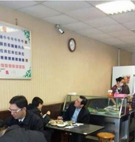 網(wǎng)友捕獲馬英九夫妻到高雄一家牛肉面店用餐,馬英九看似在張望價目表。(圖片取自臺媒)