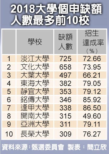 2018臺灣高校個申缺額人數(shù)最多前10校。(圖片來源:臺灣《中時電子報》)