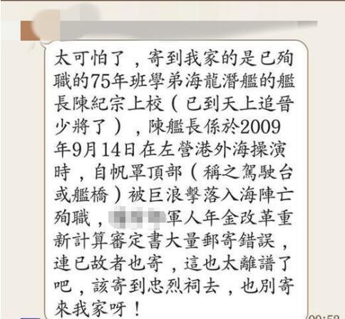 據“東森新聞云”報道,網絡上甚至流傳一張Line的截圖,有民眾表示收到已殉職將領的通知函,“太可怕!寄到我家的是已殉職的學弟海龍潛艦的艦長陳紀宗上校(已追晉少將)。陳艦長系于2009年9月14日在左營港外海操演時,自帆罩頂部(稱之駕駛臺或艦橋)被巨浪擊落入海陣亡殉職,‘國防部’軍人年金改革重新計算審定書大量郵寄錯誤,連已故者也寄,這也太離譜了吧,該寄到‘忠烈祠’去,也別寄來我家呀!”