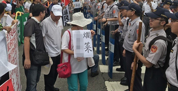 蔡英文在臺中市有數個參訪行程,反年改團體已做好沙盤推演。圖為去年7月蔡英文在臺中市林酒店參訪時,警民對峙情形。(圖片來源:臺灣《聯合報》)