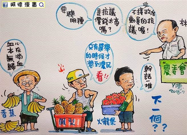 報道說,繼菠蘿、香蕉價格崩盤后,先前也傳出火龍果跌價,雖然臺灣地區農政機關疲于奔命四處滅火,但表現讓臺灣地區領導人、“行政院長”、民眾、農民都不滿意。對此,粉專“阿德漫畫”畫出嘲諷創作,圖中的“農委會主委”林聰賢指著果農說教,表示“要聰明種”“是抗議價錢太高?”“不接受政治動員的抗議喔”。而果農們也紛紛表達不滿,香蕉農說“血本無歸,心在淌血”、菠蘿農說“只有選舉的時候,才想到農民,看!”火龍果農無奈表示“干話一堆”。