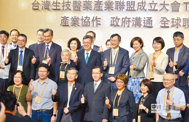 2017年臺灣生技醫藥產業聯盟成立大會,臺灣地區副領導人陳建仁(中)應邀出席致詞。(臺媒資料照片)