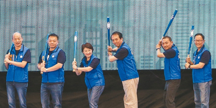 國民黨“六都”市長參選人韓國瑜(左起)、高思博、盧秀燕、陳學圣、侯友宜、丁守中化身選手,做出揮棒動作,期許打出漂亮的勝選全壘打。(圖片來源:臺灣《聯合報》)