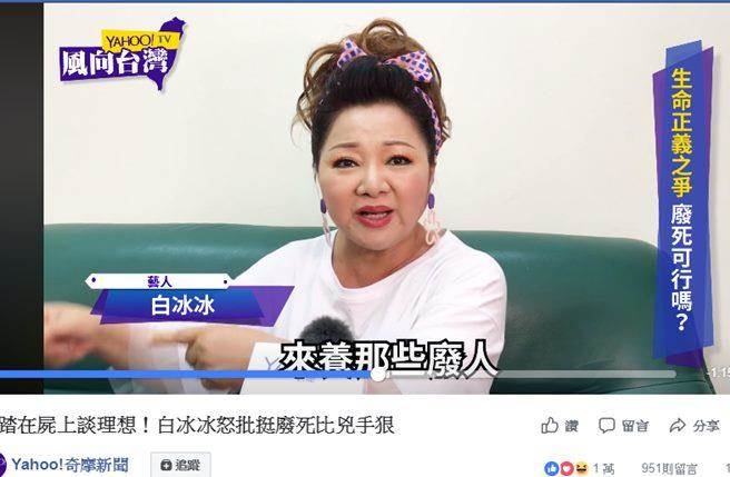 “這些讀書人是白讀書了嗎?”白冰冰稱大多數民意是不應該廢除死刑,為何臺當局不聽,是又回到帝制時代了嗎?也不解為何民眾選你們出來了,當局卻用自己的意志在做事,“然后為什么我們應該跟國際接軌?跟國際見鬼了!”反問美國是我們阿公?還是哪一國是我們阿嬤?為什么不聽自己內心話。白冰冰更向臺當局“法務部長”、法官等人喊話,“若該做的事情你不做,不應該領錢,不應該違背大家意志領大家的錢。”更舉例若是死刑犯沒死,那些被分尸的受害人父母就得繼續(xù)賺錢繳稅金來養(yǎng)這些廢人,養(yǎng)到死,讓她覺得這道理根本不對。