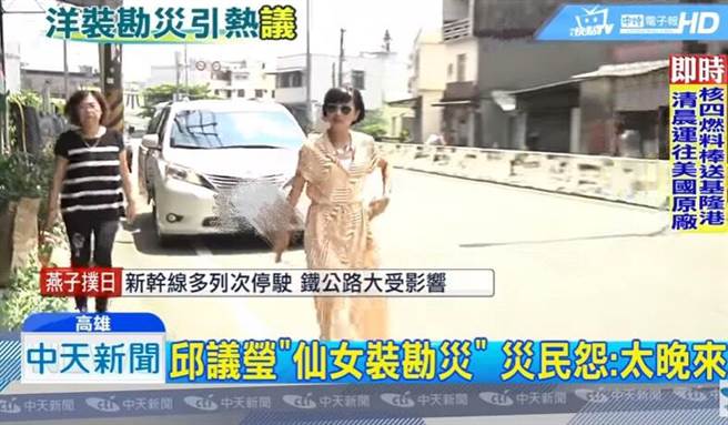 水災(zāi)過(guò)去13天后,邱議瑩終于關(guān)心燕巢危屋,但一身飄逸長(zhǎng)裙洋裝外加時(shí)尚太陽(yáng)眼鏡出現(xiàn),彷彿要去看秀,看到現(xiàn)場(chǎng)媒體還酸“太關(guān)心我了吧!”(圖片來(lái)源:臺(tái)灣中天新聞)