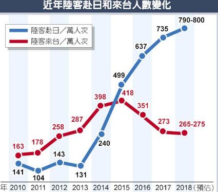 兩岸關(guān)系急轉(zhuǎn)直下,赴臺(tái)大陸游客漸減,赴日陸客大增。2017年大陸游客赴日比赴臺(tái)多462萬(wàn)人次,估計(jì)今年訪日大陸游客可望上沖到790至800萬(wàn)人次,幾乎是赴臺(tái)的3倍。