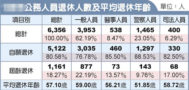 根據“銓敘部”統計,去年公務人員退離人數有9735人,其中退休人員有6356人,包括一般公務3953人、醫事538人、警察1465人及“司法”400人。值得注意的是,去年退離的警察有1802人,其中高達88.53%,有1465人是自愿退休,屆齡退休只占9.76%。以平均退休年齡來看,警察也是最低,平均51.85歲就退休,比起一般人員平均退休年齡59歲,少了7歲多。