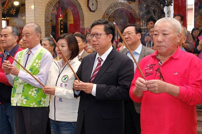 桃園市長(zhǎng)鄭文燦(前排右二)26日在八德指玄宮祈福謝票。(圖片來源:臺(tái)灣“中時(shí)電子報(bào)”)