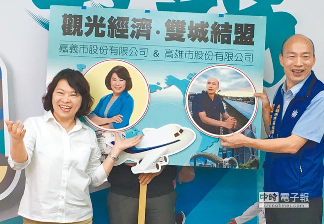 準(zhǔn)嘉義市長黃敏惠(左)、準(zhǔn)高雄市長韓國瑜于競選期間提出雙城共同拼經(jīng)濟(jì)的理念。(圖片來源:臺灣“中時電子報”)