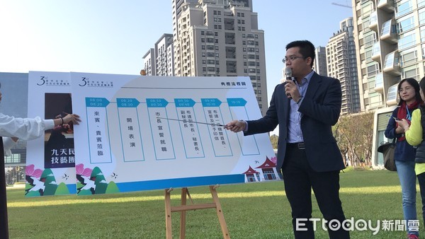 準(zhǔn)臺中新聞局長吳皇升說明25日準(zhǔn)臺中市長盧秀燕就任典禮流程。(圖片來源:臺灣“東森新聞云”)