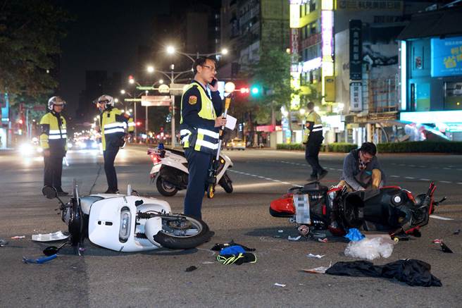 車禍現(xiàn)場一片凌亂,警方在事故現(xiàn)場測量調(diào)查。(圖片來源:臺灣“中時(shí)電子報(bào)”)