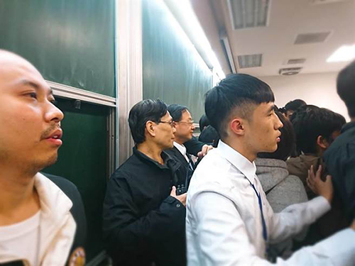 江宜樺被學生包圍在講臺前無法離開,現場氣氛火爆至極。(圖片來源:臺灣“中時電子報”)