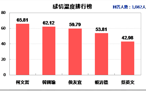 中國臺(tái)灣網(wǎng)12月24日訊 據(jù)臺(tái)灣《工商時(shí)報(bào)》報(bào)道,親綠的“臺(tái)灣民意基金會(huì)”今天公布臺(tái)灣民眾對(duì)主要政治人物的感情溫度,以臺(tái)北市長柯文哲的溫度最高、其次是高雄市長當(dāng)選人韓國瑜,被列為“反感”的蔡英文則是敬陪末座,意味著已經(jīng)被民意打入冷宮。