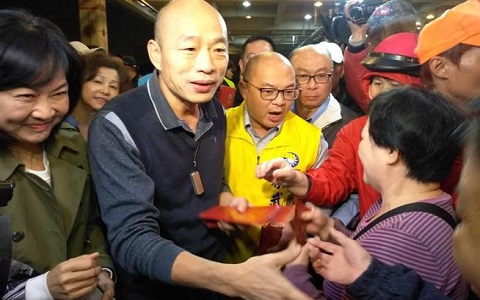 高雄巿長韓國瑜24日一早巡視前鎮魚巿場,并向漁友、魚販拜年、發紅包。(圖片來自臺媒)