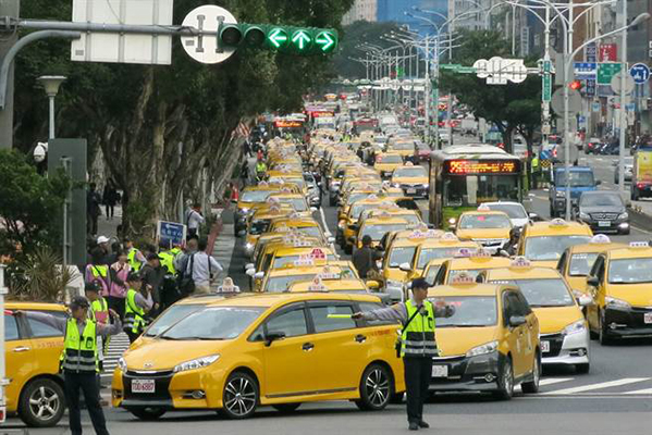 出租車31日下午繞行“行政院”抗議Uber不公平競爭。(圖片來源:臺灣“中時電子報”)